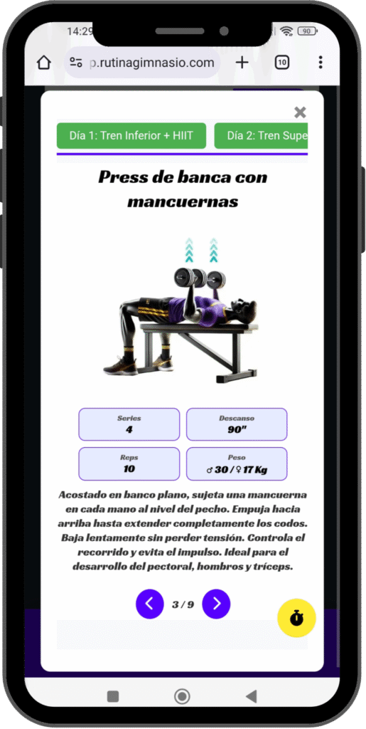 El Día 3, junto con más rutinas específicas (fuerza, definición, abdomen plano…) y un calendario mensual adaptado a tus objetivos, está disponible exclusivamente dentro de nuestra app oficial: app.rutinagimnasio.com. Allí no solo accedes a entrenamientos premium, sino también a planes nutricionales, ejercicios con imágenes, herramientas de seguimiento, gamificación con insignias y recompensas